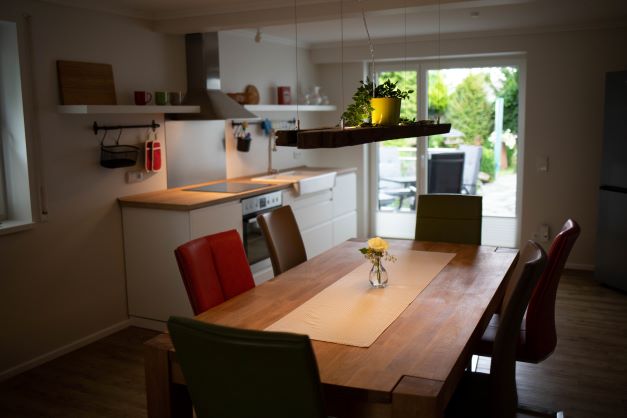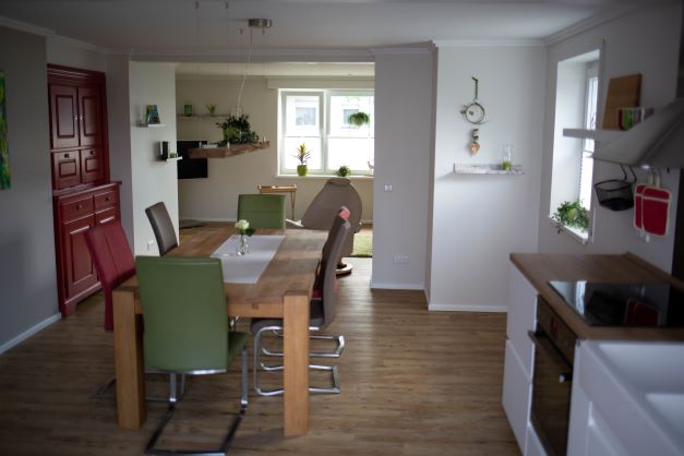 voll ausgestattete Küche (Esstisch, Küchenzeile, Kaffeemaschine, Wasserkocher, Cerankochfeld, Backofen, Kühlschrank incl. Gefrierkombination)